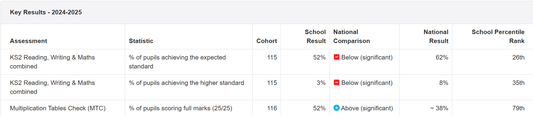 Progress Measures: This is a number derived from a calculation that compares their SAT scores in Year 2 to their scores in Year 6 and derives a progress score. A score of -3.0 to 3.0 is deemed to be acceptable progress for Reading and Maths, whilst -5.0 to 5.0 is used for writing.